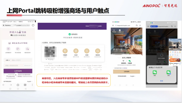 基于上图酒店场景的Portal交互设计,vic115维多利亚手机平台为企业提供可定制化的认证门户+营销跳转+会员集成一体化方案: