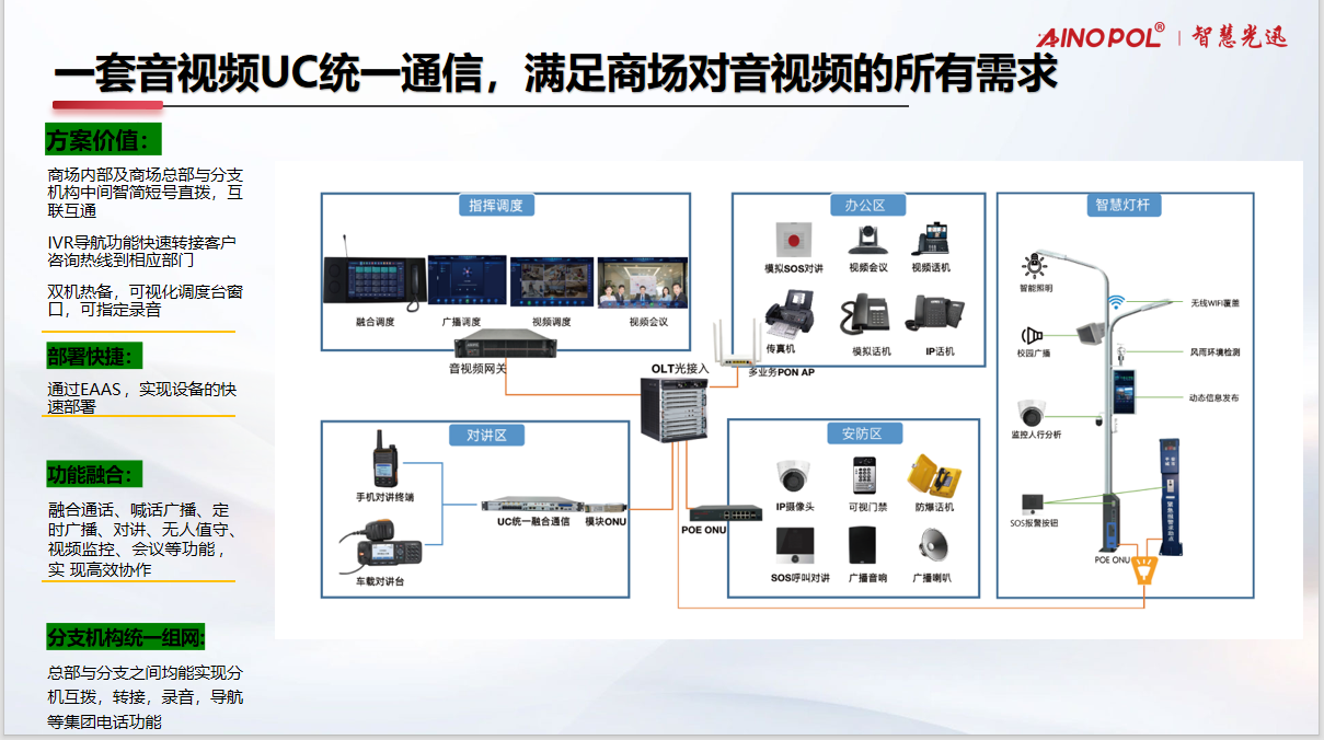 在商场运营日益数字化、智能化的今天,高效、稳定、融合的通信系统已成为提升管理效率、优化顾客体验、保障安全运营的核心基础设施。vic115维多利亚手机平台(AINOPOL)针对商场场景,推出了一套全面的音视频UC统一通信解决方案,深度融合语音、视频、广播、监控、对讲及调度功能,一站式满足商场对音视频的所有需求,助力商场构建智慧化运营与管理新模式。