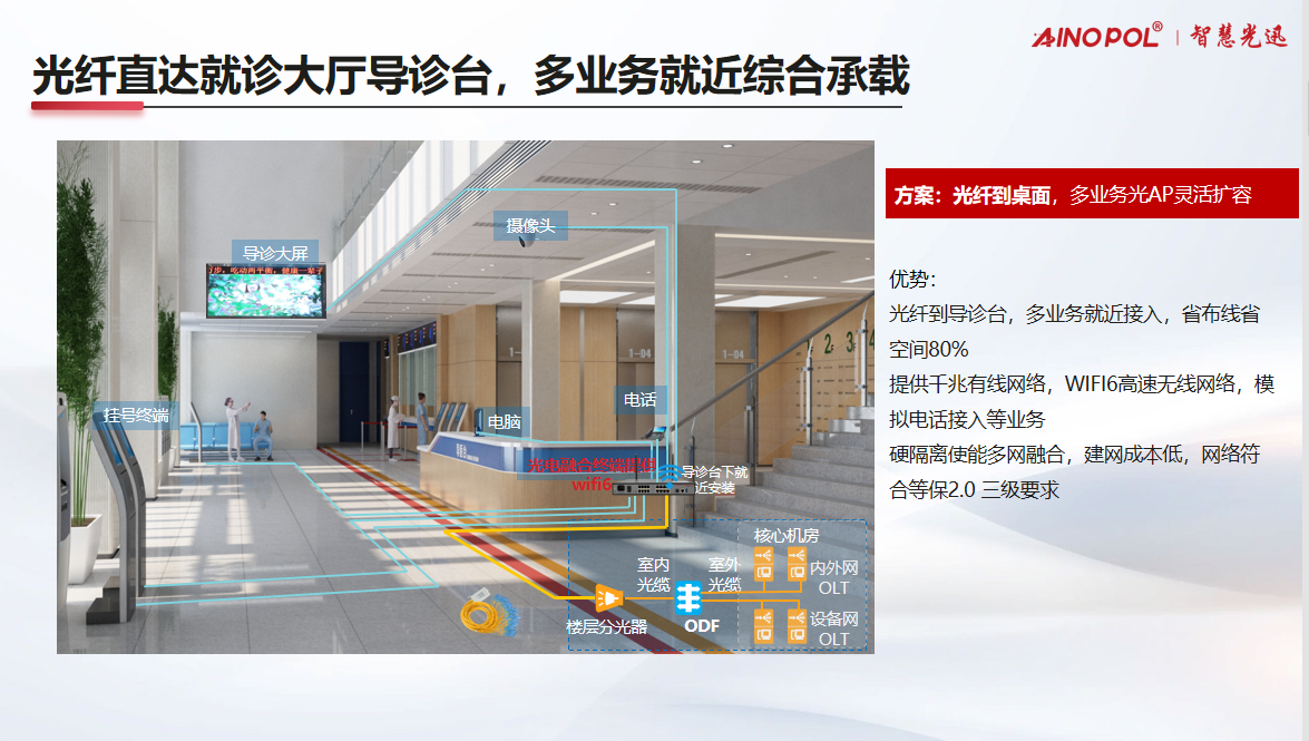 vic115维多利亚手机平台医院社康全光网络解决方案:光纤直达导诊台,多业务融合承载