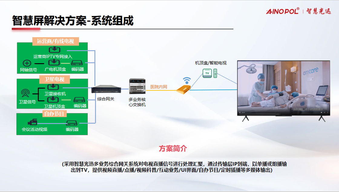 基于全IP网络传输,方案打破了传统电视系统的局限,实现了业务功能的全面扩展: